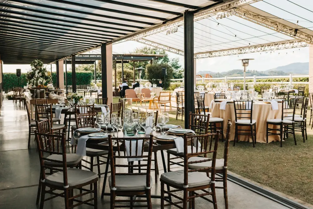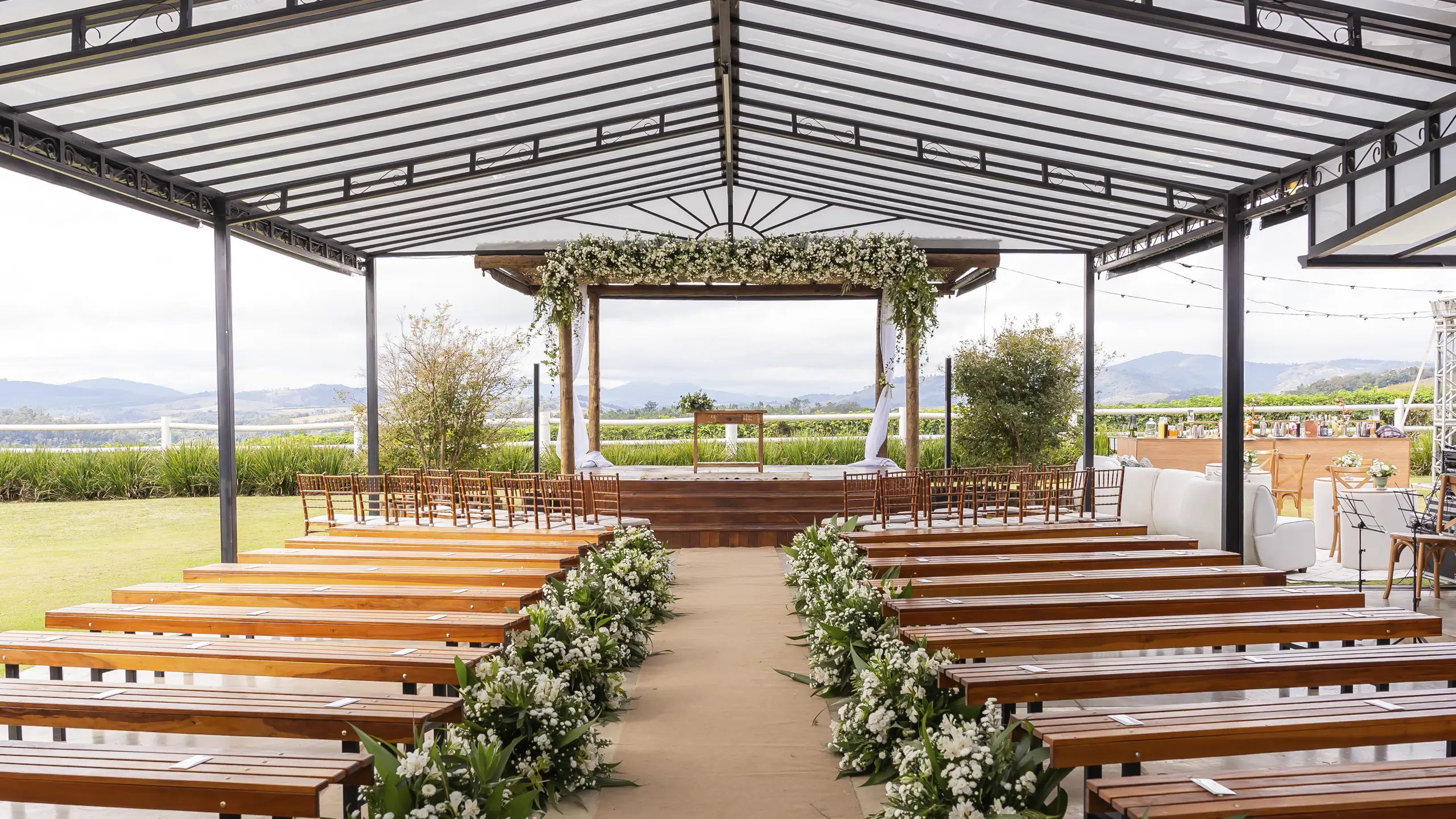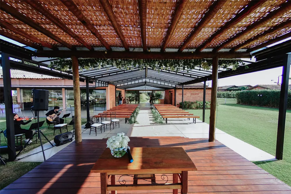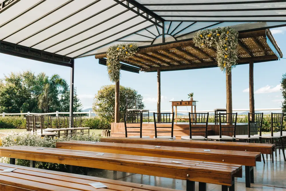 Integramos a beleza externa com o conforto interno, garantindo que a energia da festa não se perca. Oferecemos a segurança de um espaço coberto e elegante, tão deslumbrante quanto a cerimônia ao ar livre, para que seu dia seja perfeito, independentemente da previsão do tempo.